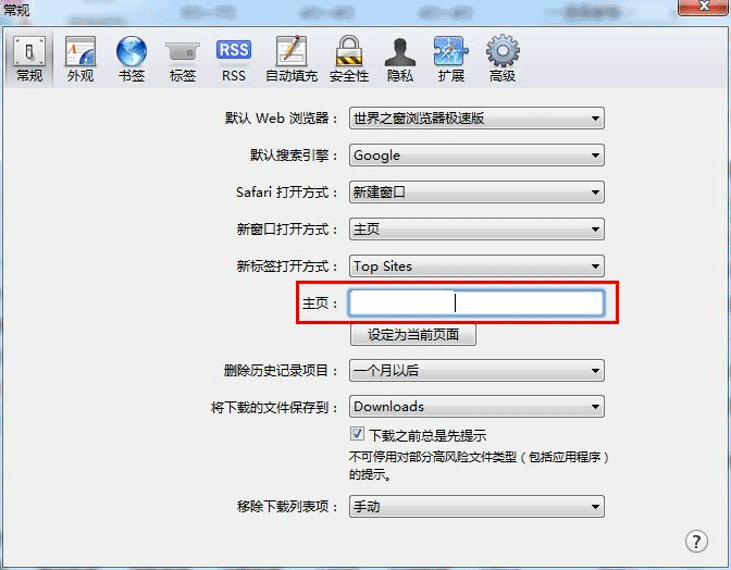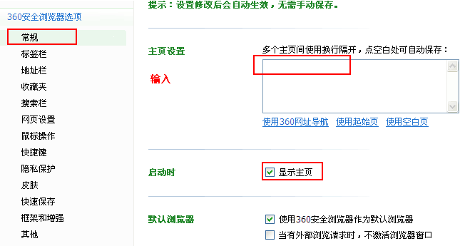 2)然后在打开的对话窗口中的主页设置的地址输入框中输入“https://wz1.0755120.xyz/”设置修改后会自动生效,无需手动保存。如图所示: