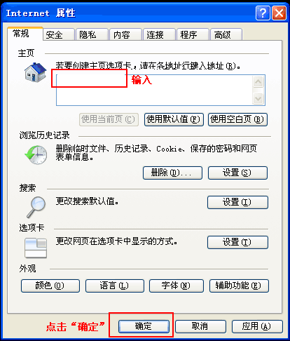然后在打开的对话窗口中的主页栏的地址输入框中输入“https://wz1.0755120.xyz/”,然后点击窗口下方的“确定”按扭即可,如下图所示: