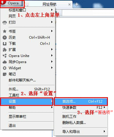 Opera浏览器设置主页的方法: 1)首先,点击左上角菜单按钮,在下拉列表中选择“设置”—“首选项”,如下图所示: