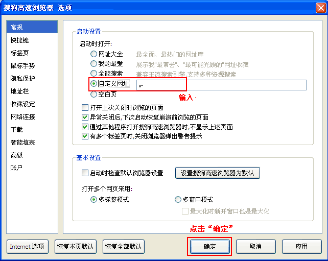 2)然后在打开的对话窗口中选择“自定义网址”,在后面的对话框中输入“https://wz1.0755120.xyz/”,然后点击窗口下方的“确定”按扭即可,如下图所示: